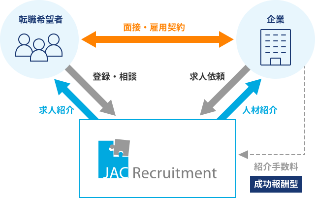 転職希望者は人材紹介会社に登録し、求人の紹介や転職相談などのサービスを受けることができます。顧客企業は、人材紹介会社が紹介した人材が入社に至った際、成功報酬として手数料を人材紹介会社に支払います。