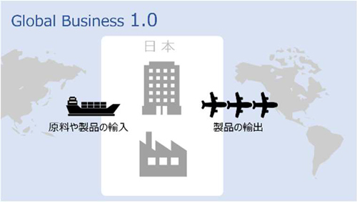 - グローバルビジネス1.0:海外拠点を置かず貿易で海外市場にアクセスする段階