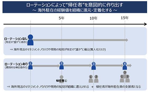 そしてこのローテーションは、本社の中に着実に海外駐在経験者が増えていくところに意義があります。この海外駐在経験者は、日本(本社)にいながら現地駐在員を強力に支援することができます。裏を返せば、強固な支援体制があれば、経験・能力的にやや心許ない人材を駐在員として派遣しても、いざという時には手助けをすることができるということであり、それは駐在要員を見いだす上で選択肢を拡げられるということでもあるのです。